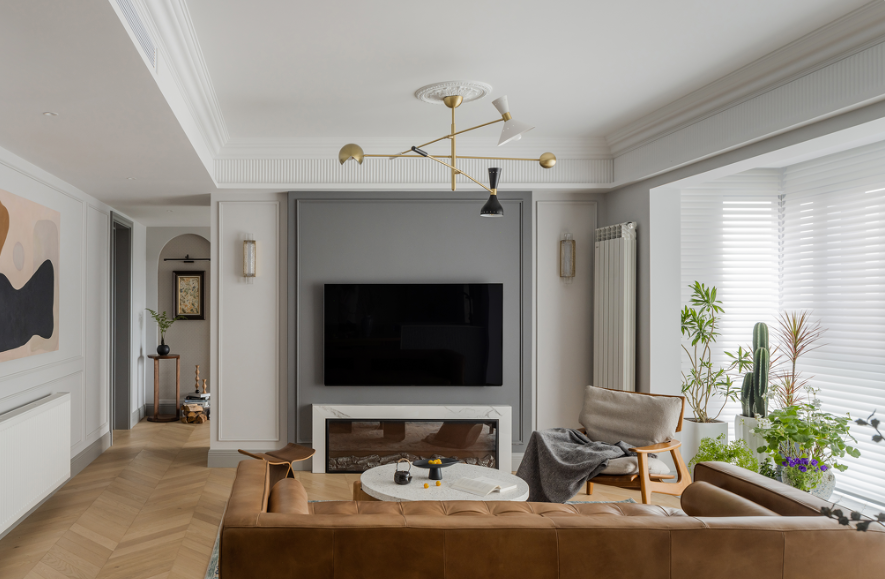 客廳作為休閑空間,不僅增加功能性設計。還為了貼合整體基調,精裝房原有的電視背景墻換成了簡約歐式風格,搭配淡雅的色彩,讓舒適輕松的休閑體驗回歸客廳。